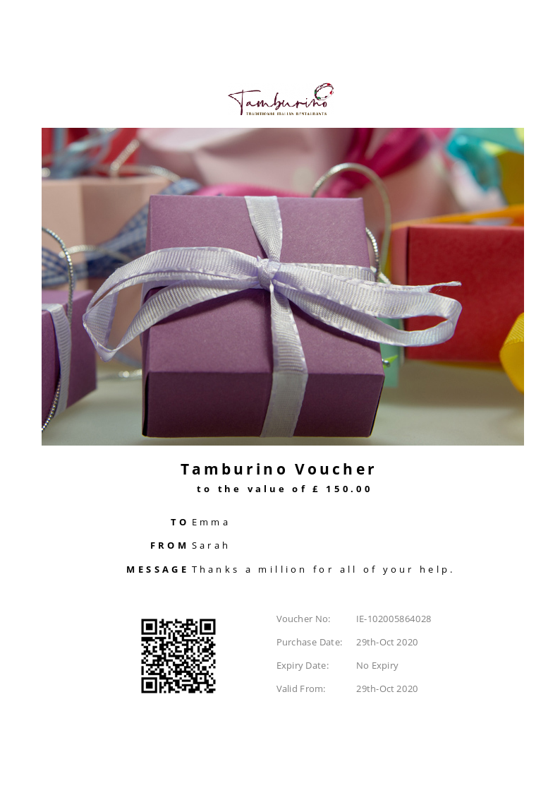 Tamburino Restaurants allows you to purchase instantly printable gift vouchers, special offers and tickets using the Voucher Connect platform.